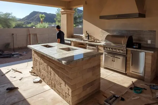 The cost of an outdoor kitchen in Arizona can range anywhere from $8,000 to $25,000 or more, depending on size, materials, and features. A simple BBQ island with storage and a countertop will cost less, while a fully equipped outdoor kitchen with appliances, stonework, utilities, and a pergola cover will be on the higher end.